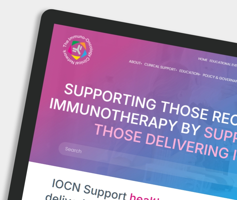 The looped masthead video at the top of the homepage immediately conveys the organisation’s mission to support healthcare professionals delivering immunotherapy. The homepage also showcases the network’s five core pillars - Education & Training, Clinical Support, Service Development, Research & Analysis, and Policy & Governance, each colour coded and linked to their respective pages.